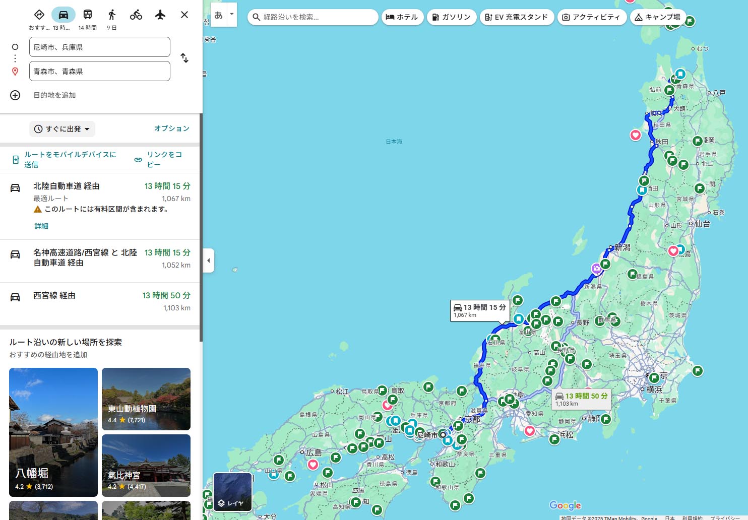 ルートは有料道路中心に日本海側をひたすら北上。